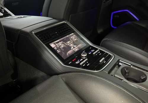 Escudo Porsche en los reposabrazos de la consola central